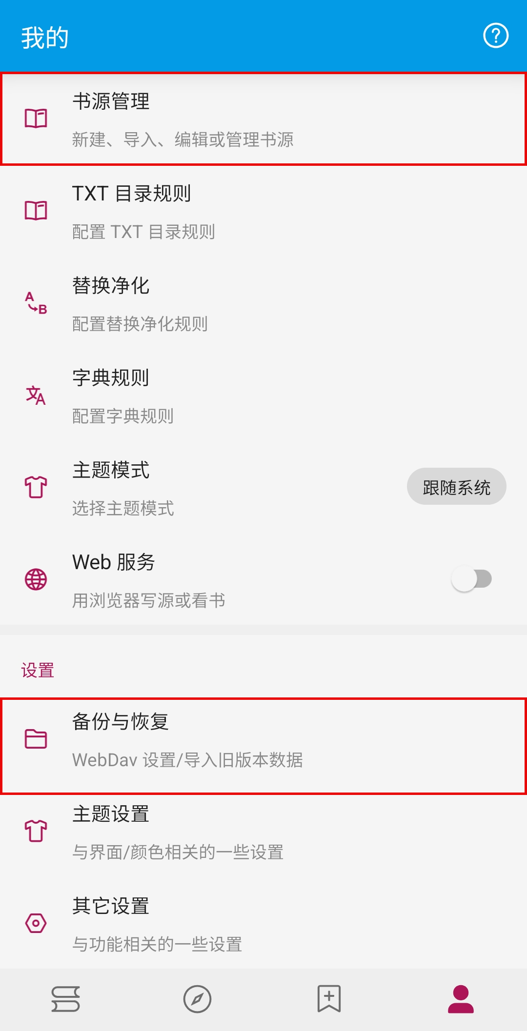 【书源管理】和【备份与恢复】这两项非常重要,稍后讲解