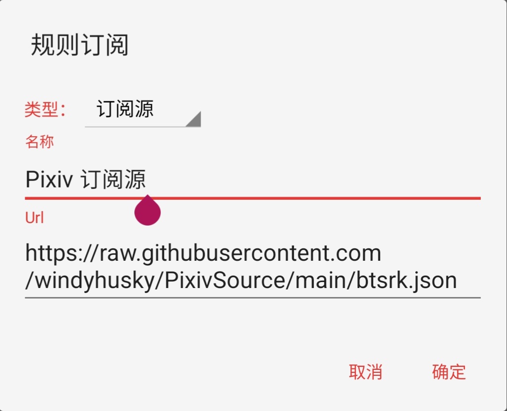 https://raw.githubusercontent.com/DowneyRem/PixivSource/main/btsrk.jsonhttps://raw.githubusercontent.com/DowneyRem/PixivSource/main/books.json1. 打开【订阅】页面,点击【规则订阅】