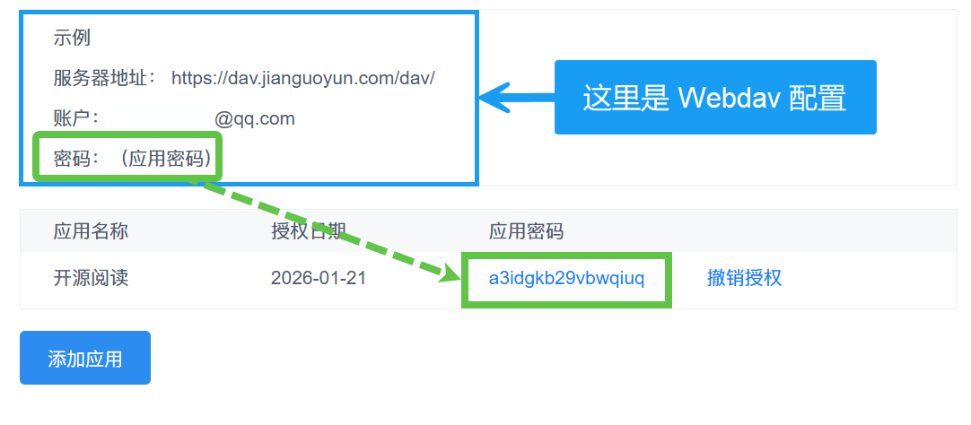 - WebDav 密码:(刚刚生成的应用密码)